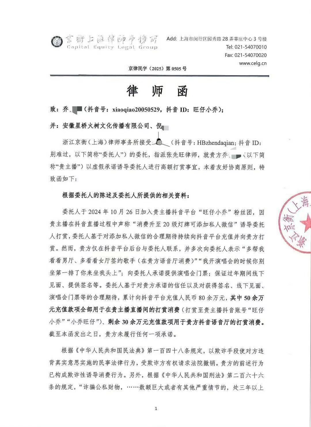 据“别难过”公开发布的律师函显示,他于2024年10月26日加入“旺仔小乔”粉丝团,因主播在直播过程中声称“消费升至20级灯牌可添加私人微信”诱导打赏,他基于对添加私人微信的合理期待持续向平台充值并打赏,累计向平台充值人民币80余万元,其中50余万元充值款项全部用于“旺仔小乔” “小乔旺仔”直播间打赏,剩余30余万用于语音厅的打赏消费。